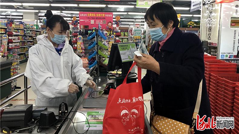 3月23日,石家庄市北国超市翟营店,一位顾客拿着自备购物袋购物。 河北日报记者贾楠摄
