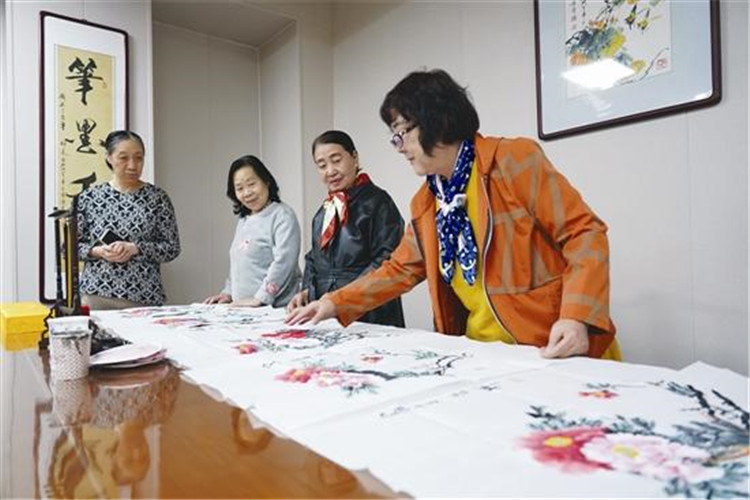 3月24日,居住在河北省唐山市古冶区安馨医疗养老庄园的老人在娱乐室内参观画作。