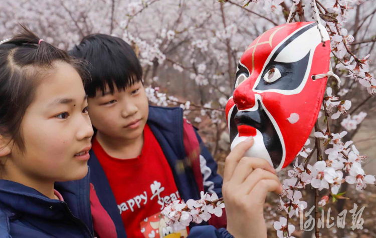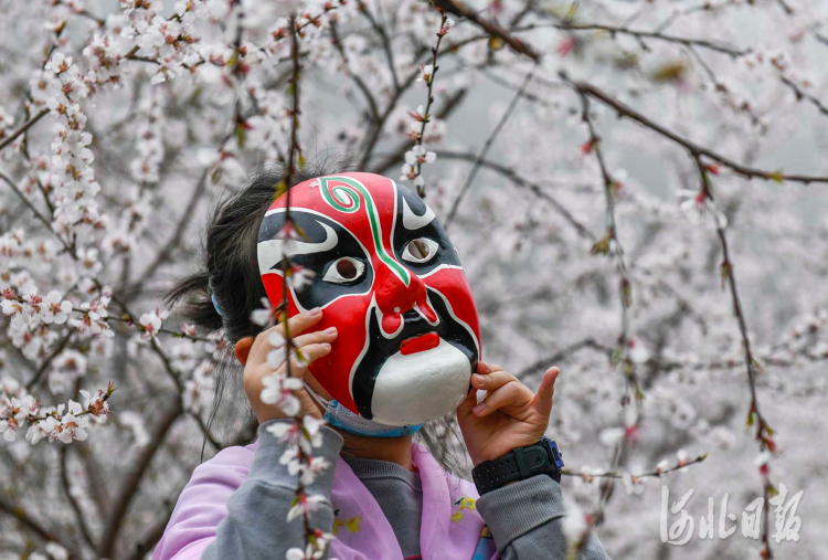 2021年3月27日是“世界戏剧日”,河北省遵化市党峪镇桃花山景区将京剧脸谱面具挂在花枝上,供游客观赏、拍照,感受传统文化的魅力。通讯员 刘满仓 摄影报道