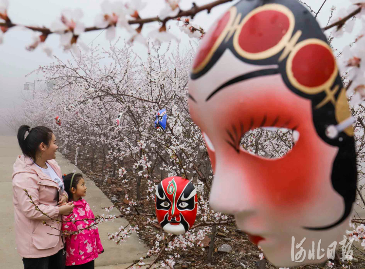 2021年3月27日,游客在河北省遵化市党峪镇桃花山景区观赏花枝上布置的京剧脸谱面具。通讯员 刘满仓 摄影报道