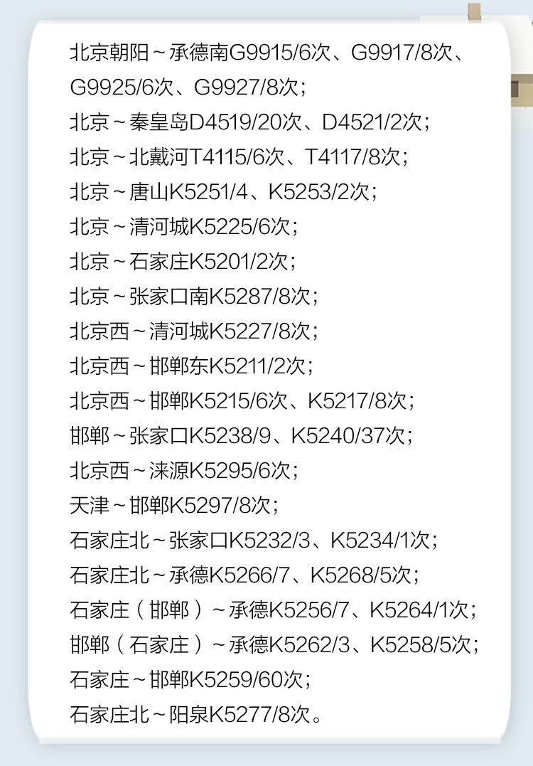北京局计划增开京津冀区域中短途旅客列车37对,包括承德南、秦皇岛、北戴河、唐山、清河城、张家口、石家庄、邯郸、涞源等方向的区域中短途旅客列车,主要车次为: