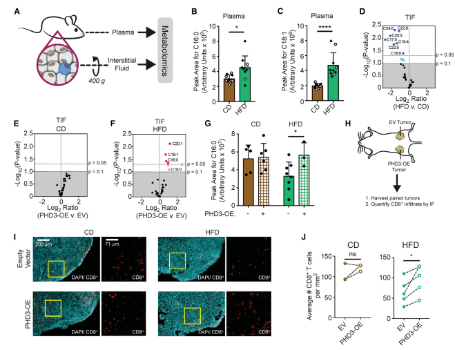 研究人员在肿瘤细胞中过表达 PHD3(PHD3-OE),发现与高脂饮食小鼠的野生型肿瘤相比,高脂饮食小鼠的肿瘤微环境中 FFA 种类的浓度增加,PHD3-OE 肿瘤的生长更加缓慢并且 CD8+T 细胞含量增加。