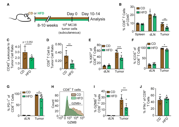 研究人员为揭示肥胖对患有不同类型癌症小鼠的影响,分别为不同组的小鼠提供高脂饮食(high-fat diet,HFD)和对照饮食(control diet,CD)。结果发现高脂肪饮食诱导的肥胖会损害小鼠肿瘤微环境中 CD8+T 细胞的功能,加速肿瘤的生长和进展。