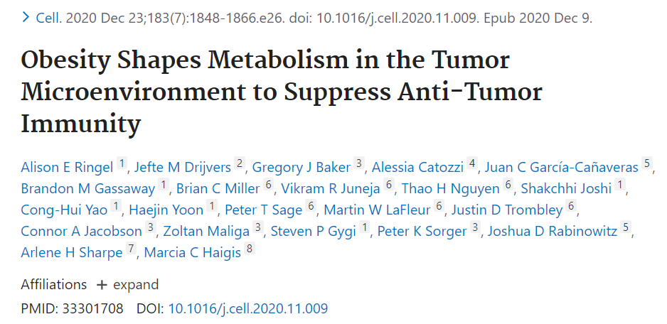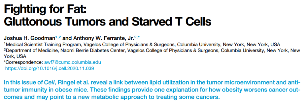 近日,哥伦比亚大学 Joshua H. Goodman 和 Anthony W. Ferrante, Jr. 在杂志 Cell 上在线发表题为《Fighting for Fat: Gluttonous Tumors and Starved T Cells》 的文章,以 Previews 的形式针对哈佛医学院研究团队 12 月 23 日在 Cell 发表的题为《Obesity Shapes Metabolism in the Tumor Microenvironment to Suppress Anti-Tumor Immunity》的研究成果,进行了探讨,该研究成果揭示了在争夺能量的战斗中,饕餮肿瘤如何与饥饿的 T 细胞抢夺脂肪,肥胖是如何重塑肿瘤微环境代谢状态、抑制抗肿瘤免疫的。
