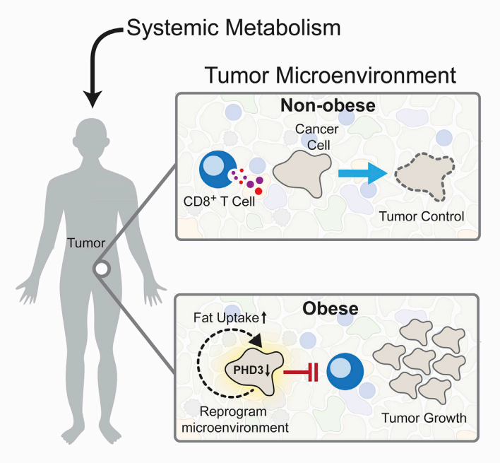 以往研究表明 Prolyl hydroxylase 3(PHD3)可以抑制过度脂肪代谢,研究人员发现,肥胖环境下的癌细胞,相比于正常环境下的 PHD3 表达明显降低。因此研究人员推测 PHD3 的下调会增强脂肪酸在肿瘤细胞中的代谢,从而降低了肿瘤微环境中可利用的脂肪酸含量,进而降低了 CD8+T 细胞数量和抗肿瘤活性。