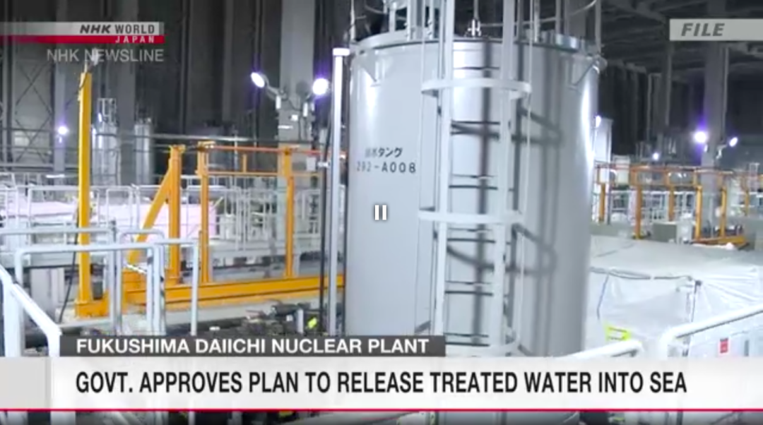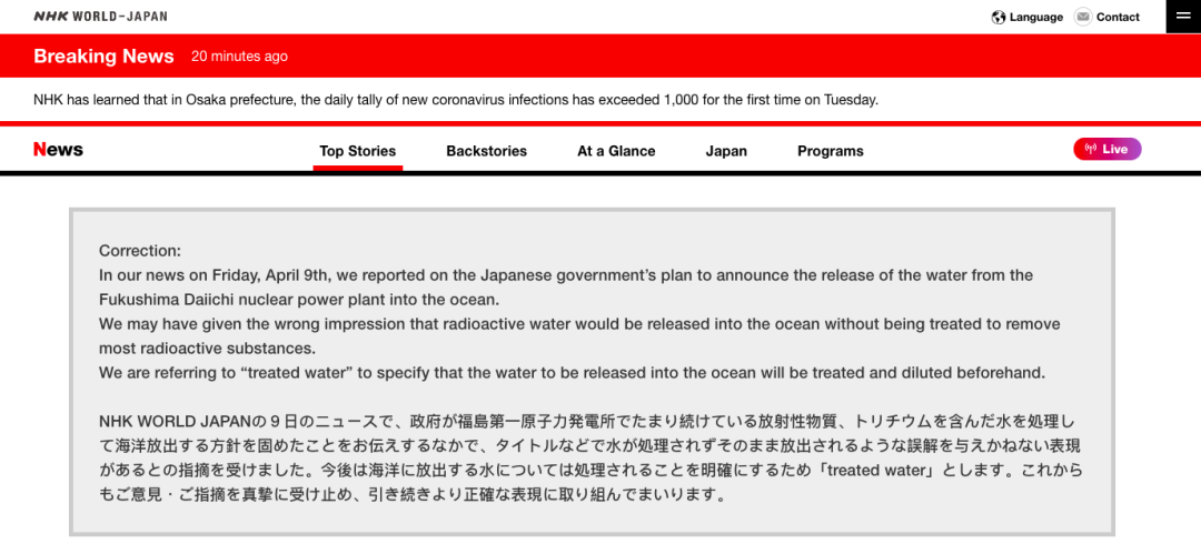 NNK 首页:4 月 9 日的新闻中,我们可能给人造成了错误印象。事实上,我们指的是「处理过的水」,会对释放到海洋中的水进行事先处理和稀释。(图源:NHK News)
