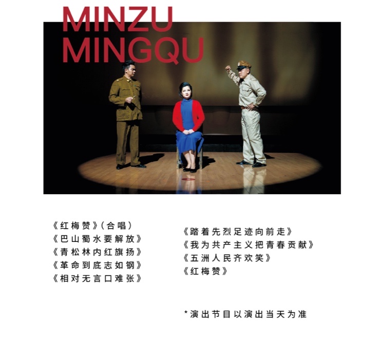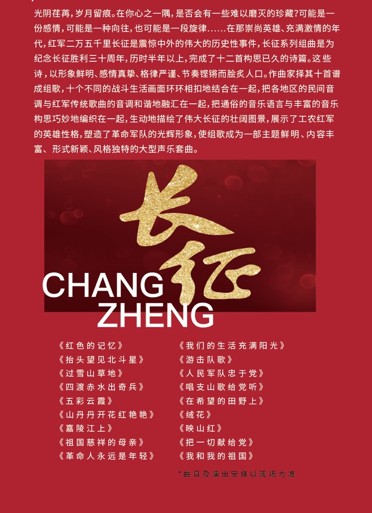 5月7日、8日分别为重庆市歌剧院带来的民族名曲经典系列之《在烈火中永生——红岩精神主题音乐会》和《长征》歌曲专场。其中《长征组歌》是为纪念长征胜利三十周年,历时半年以上,完成的十二首构思已久的诗篇,作曲家择其十首谱成组歌,十个不同的战斗生活画面环环相扣地结合在一起,把各地区的民间音调与红军传统歌曲的音调和谐地融汇在一起,把通俗的音乐语言与丰富的音乐构思巧妙地编织在一起,生动地描绘了伟大长征的壮阔图景,展示了工农红军的英雄性格,塑造了革命军队的光辉形象,使组歌成为一部主题鲜明、内容丰富、形式新颖、风格独特的大型声乐套曲: