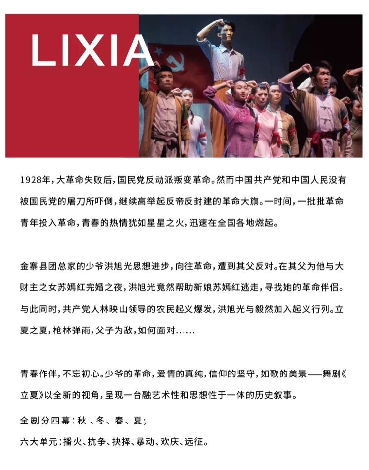 7月15日、16日,为合肥演艺股份有限公司演出的大型民族舞剧《立夏》,该剧为国家舞台艺术精品工程剧目。讲述了1928年大革命失败后,国民党反动派叛变革命,但是中国共产党和中国人民没有被国民党的屠刀所吓倒,继续高举起反帝反封建的革命大旗,一时间,一批批革命青年投入革命,青春的热情犹如星星之火,迅速在全国各地燃起: