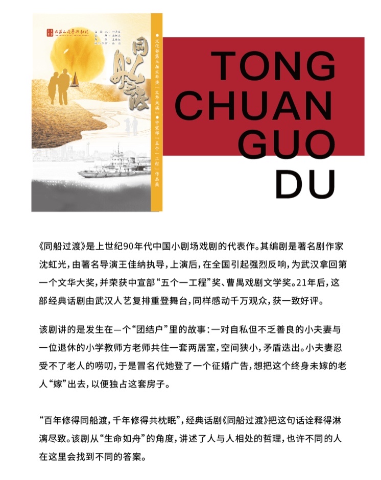 5月18日、19日为武汉人民艺术剧院带来的经典话剧《同船过渡》,该剧是上世纪90年代中国小剧场戏剧的代表作,编剧为著名剧作家沈虹光,讲述了发生在一个“团结户”里的故事: