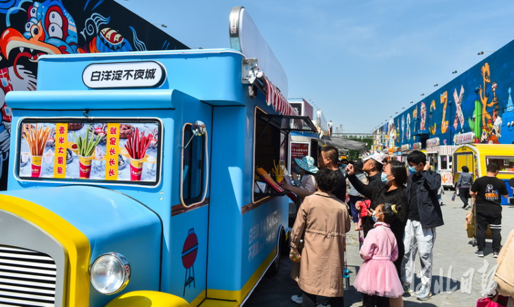 2021年5月2日,游客们在安新县白洋淀不夜城品尝美食。
