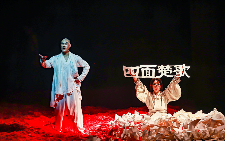 《十面埋伏》尝试打破传统舞剧的叙事方式,作品并未着力于讲述故事,而是将两千多年前的一组人物从故事中提炼出来,放在更广阔的时空概念里,运用舞蹈和综合舞台手段,刻画每一个角色在特定时间、空间、处境下的内心冲突与纠葛。剧中演员妆容以传统京剧扮相为源头,服装造型也同样源自东方经典元素。在当代创作语言里,蕴含着古老东方的神秘、经典、哲理意味。整台演出不见刀枪,却隐隐蛰伏危机,正所谓“十面埋伏”。