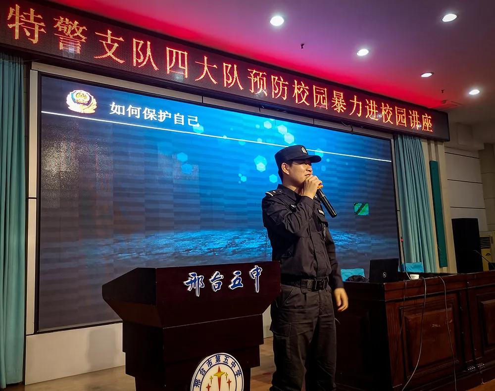 5月20日,邢台特警支队四大队民警来到邢台五中,开展“预防校园暴力”主题讲座,并对学校保安开展防暴器械使用和警务技能专项培训。