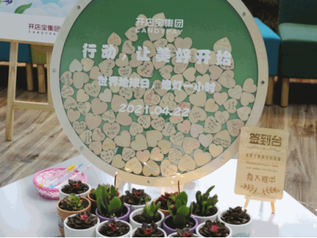 环保宣言&领取绿植:世界地球日当天,开店宝发起“环保宣言”活动,公司内工作人员写下自己环保宣言,公司将其记录在签到墙上。同时,完成宣言的同事能够领养一盆多肉绿植,为身边的工作环境增添一抹绿色,为地球的美好明天做出自己的贡献。