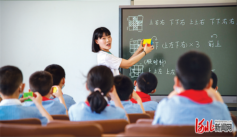 5月26日16时35分,石家庄市草场街小学魔方社的同学们正在老师的指导下练习。