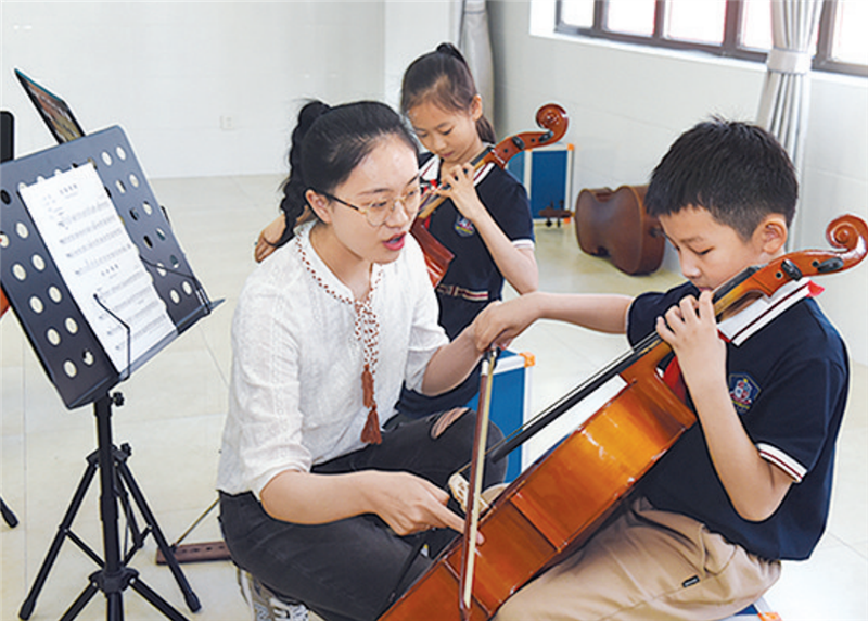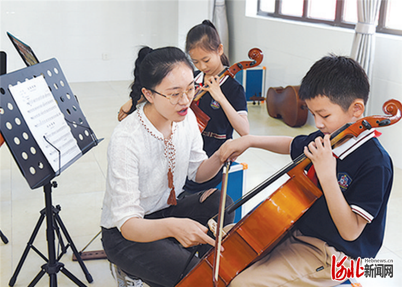 5月26日16时,邯郸市丛台区荀子实验小学的老师在教学生们练习提琴。