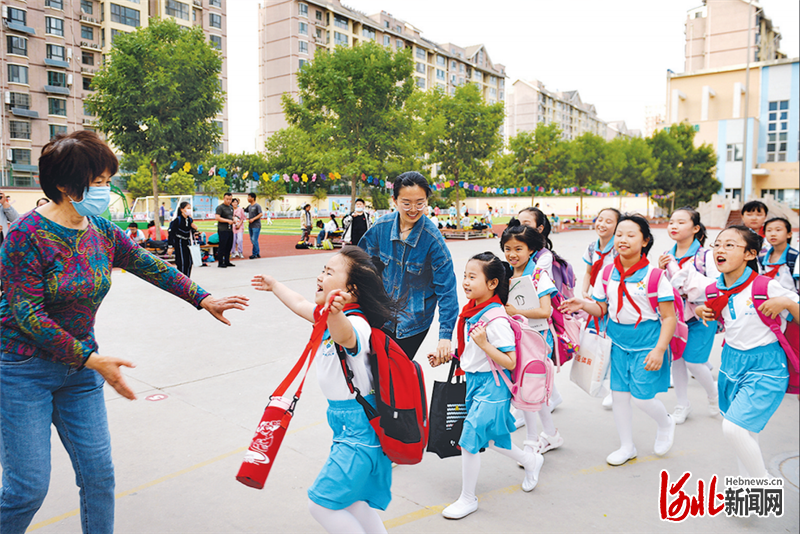 5月26日17时15分,石家庄市草场街小学的同学们结束了校内社团活动,开心走出校门。