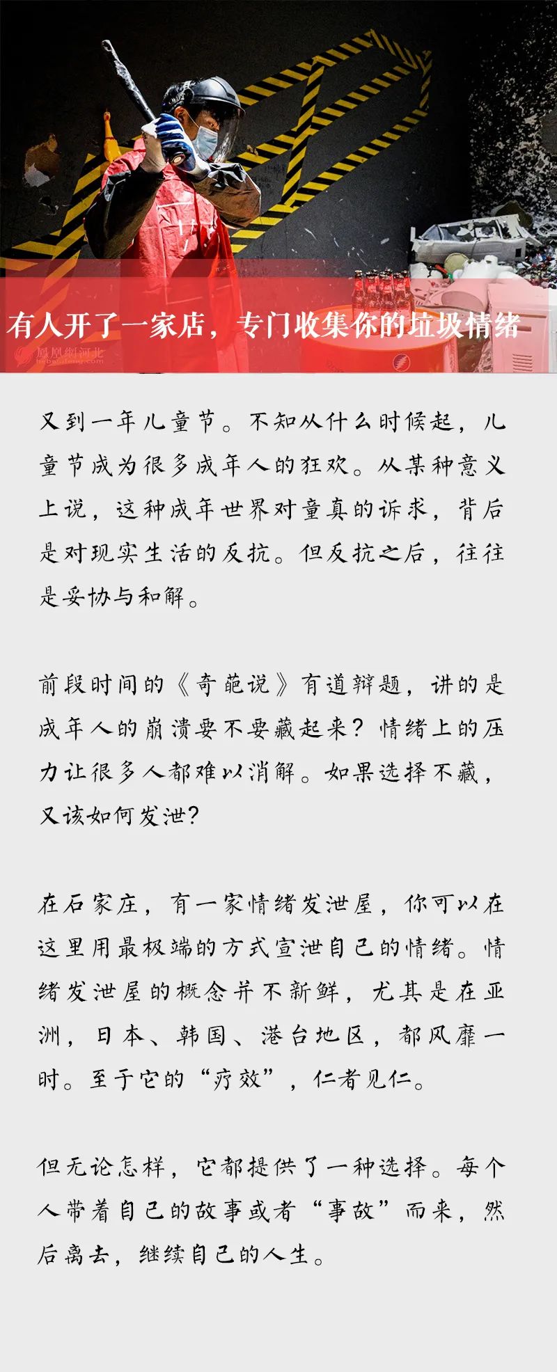 不过,张伟旗也说,这样的发泄方式,他“不能报一个明确的态度,只能处于中立态度”。关键在于,实际的使用效果,以及当事人是否认同。“情绪发泄屋的效果评价,很难有一个统一的标准,只要是有实际的减压效果,就算起到了作用。”张伟旗说,“让来发泄的人群,痛苦地来,轻松地去。”