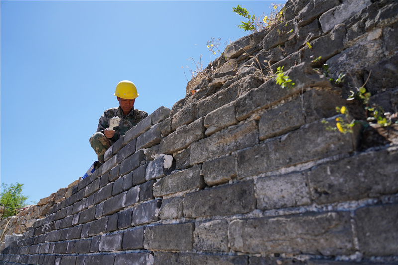 6月3日,工人在喜峰口西潘家口段长城保护维修工程现场施工。
