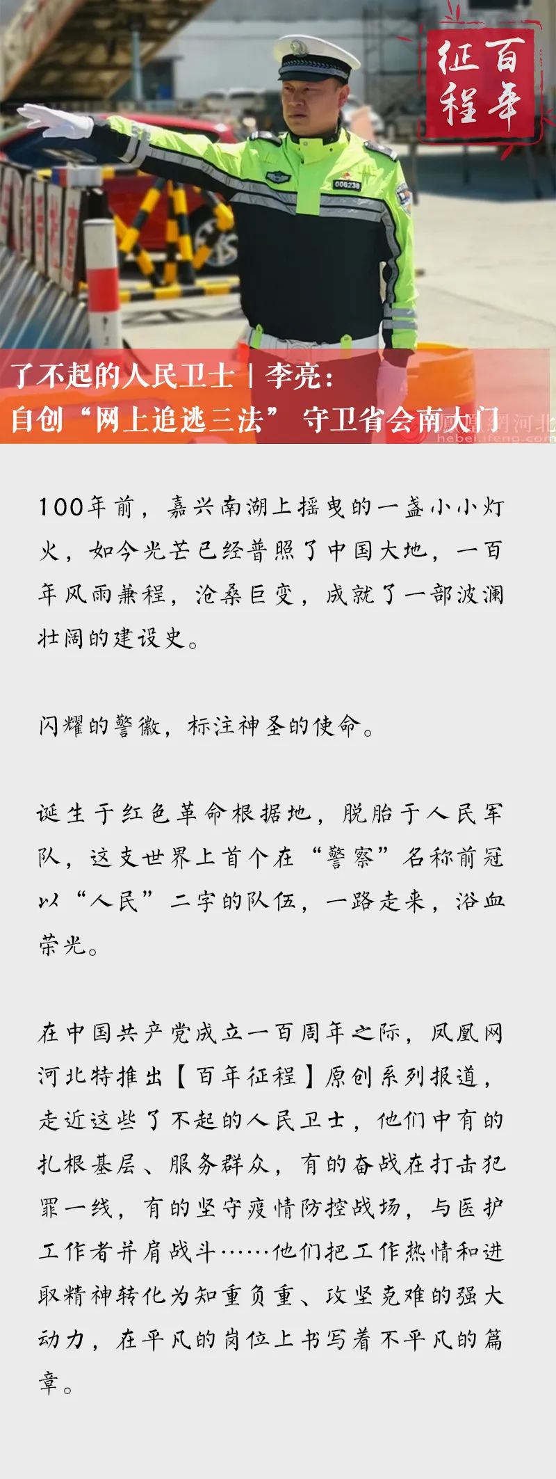 李亮,35岁,中国共产党党员,现任石家庄市公安局交通管理局胜利南综合警务服务站负责人。从警十五年来,用行动去实现全心全意为人民服务的根本宗旨,科学运用查缉布控系统,创新性推出了“李亮抓逃法”,先后荣立个人三等功3次,2020年被评为全国公安系统抗击新冠肺炎疫情先进个人,荣获第二十届“石家庄青年五四奖章”。