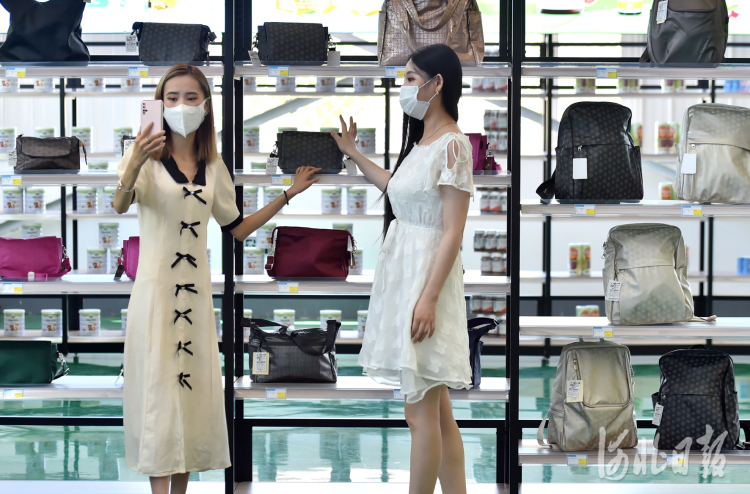 2021年6月19日,在河北省石家庄跨境电商产业园跨境电子商务保税监管中心商品展示区,直播人员进行货品线上推介。