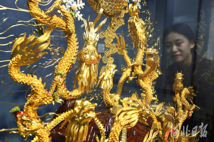 2021年6月19日,市民在河北省张家口市非物质文化遗产体验馆参观花丝镶嵌艺术作品《盛世龙腾》。
