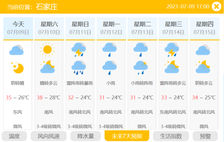 9日夜间到10日白天,北部设区市(张家口、承德、唐山、秦皇岛)最高气温为29℃至33℃,中南部设区市为34℃至38℃。10日夜间到11日白天,北部设区市最高气温为31℃至33℃,中南部设区市为32℃至37℃。11日夜间到12日白天,北部设区市最高气温为24℃至29℃,中南部设区市为27℃至35℃。