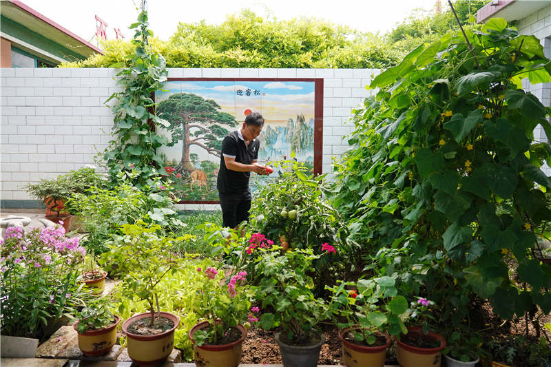 7月10日,河北省滦州市榛子镇东河南庄村村民在自家院子内打理种植的植物。