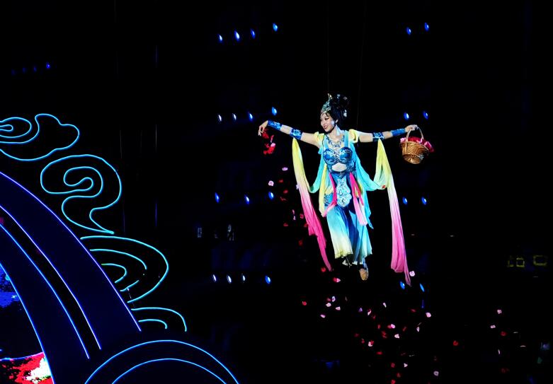 7月10日,在秦皇岛市北戴河区碧螺塔酒吧公园,演员为游客表演大型实景秀《浪淘沙·北戴河》。 新华社记者杨世尧摄