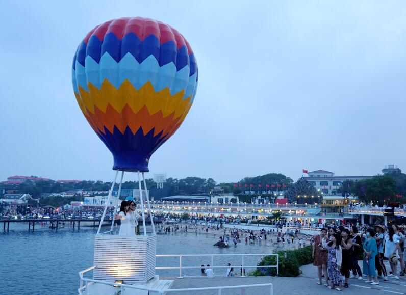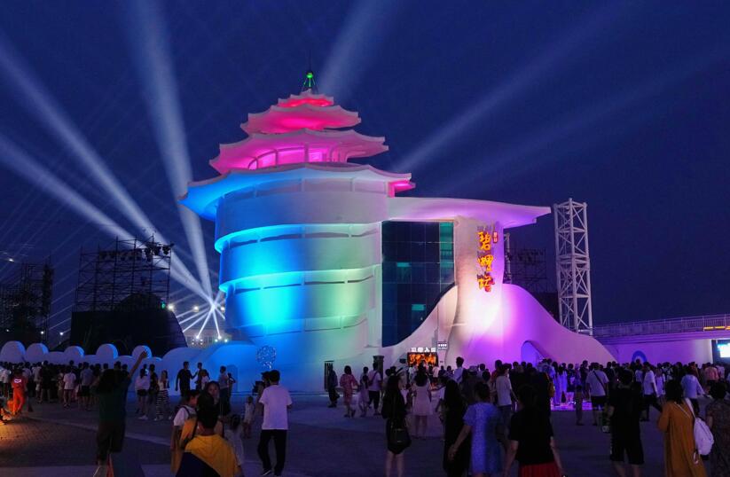 7月10日,游客在秦皇岛市北戴河区碧螺塔酒吧公园游览拍照。