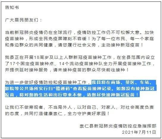据不完全统计,包括江西抚州崇仁县、浙江宁波宁海县、福建晋江市等十地,都发布了类似“原则上不允许未接种新冠病毒疫苗的人员(禁忌症者除外)进入超市、医院、学校、车站、监所、电影院等重点公共场所”的通告。