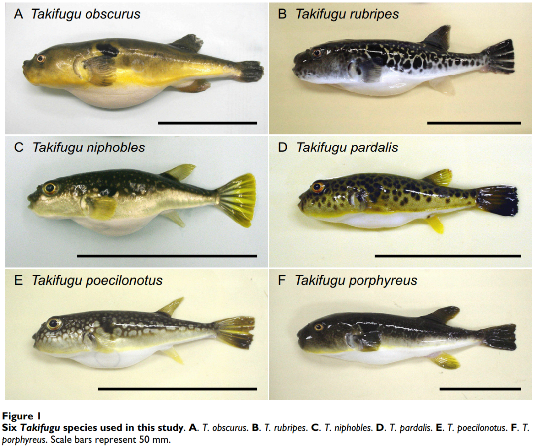 6个种类的河豚鱼:A. 暗纹东方鲀;B. 红鳍东方鲀;C. 星点东方鲀;D. 豹纹多纪鲀;E. 斑点多纪魨;F. 紫色多纪魨 | [15]