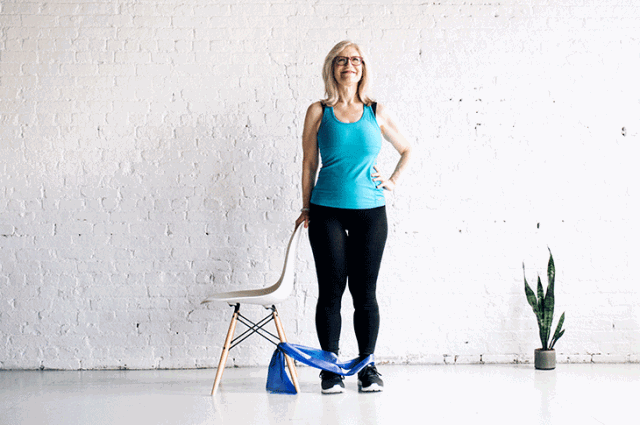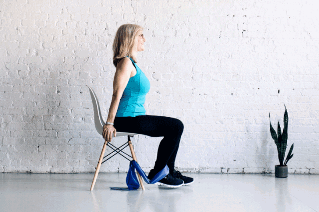 将右脚脚踝和椅子脚上套弹力带