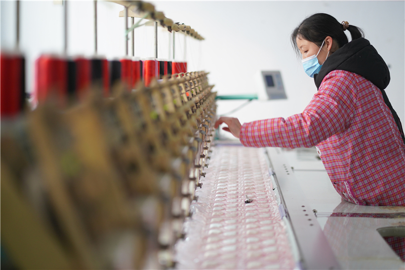 1月7日,河北省内丘县一家玩具企业的工人在绣花车间工作。