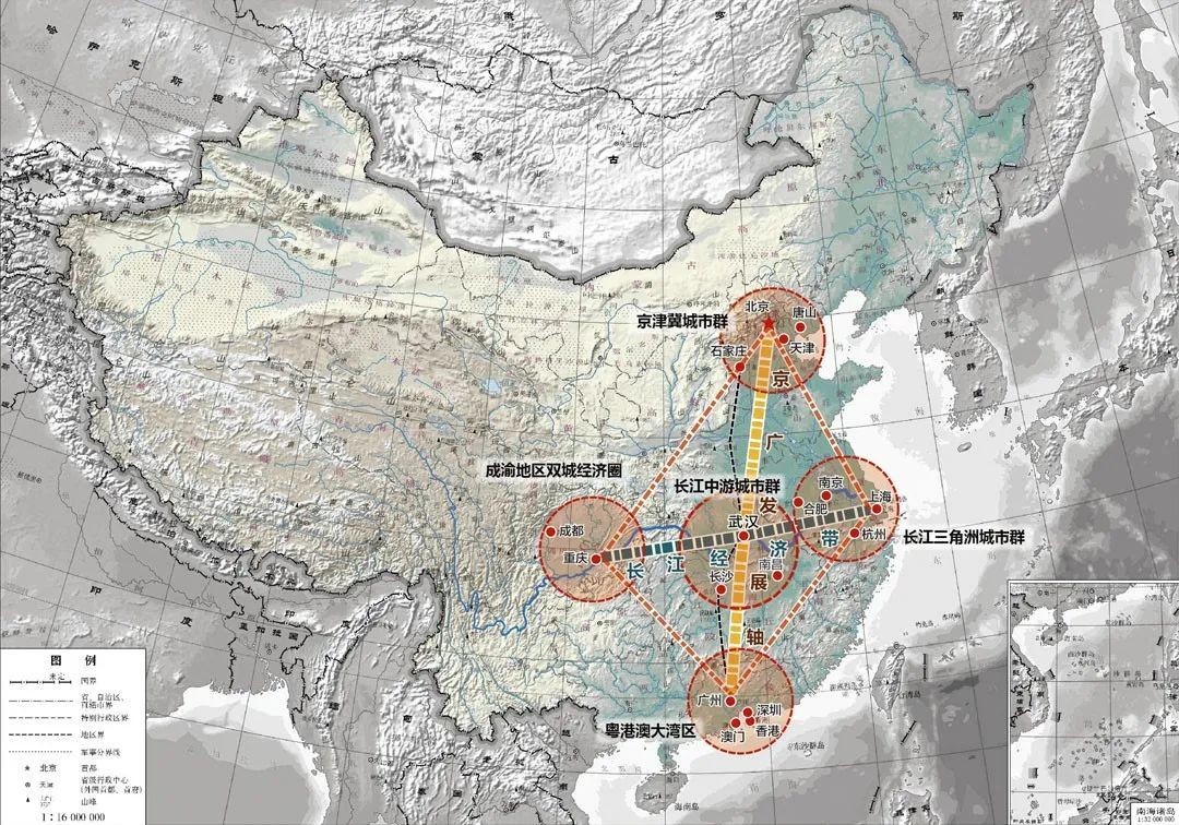 以武汉为圆心,半径1000公里,北至北京,东至上海、南至广深,西至成渝与西安,囊括了中国主要的经济区,处于天元之位。