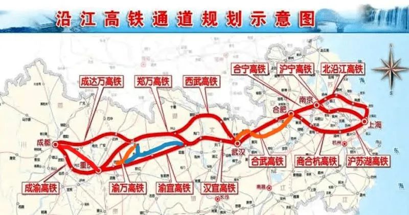 在东西方向,除了已开通的时速250公里沪汉蓉快铁,还将新建时速350公里的沪蓉沿江高铁,强化长江经济带在沿江两岸的互联互通。