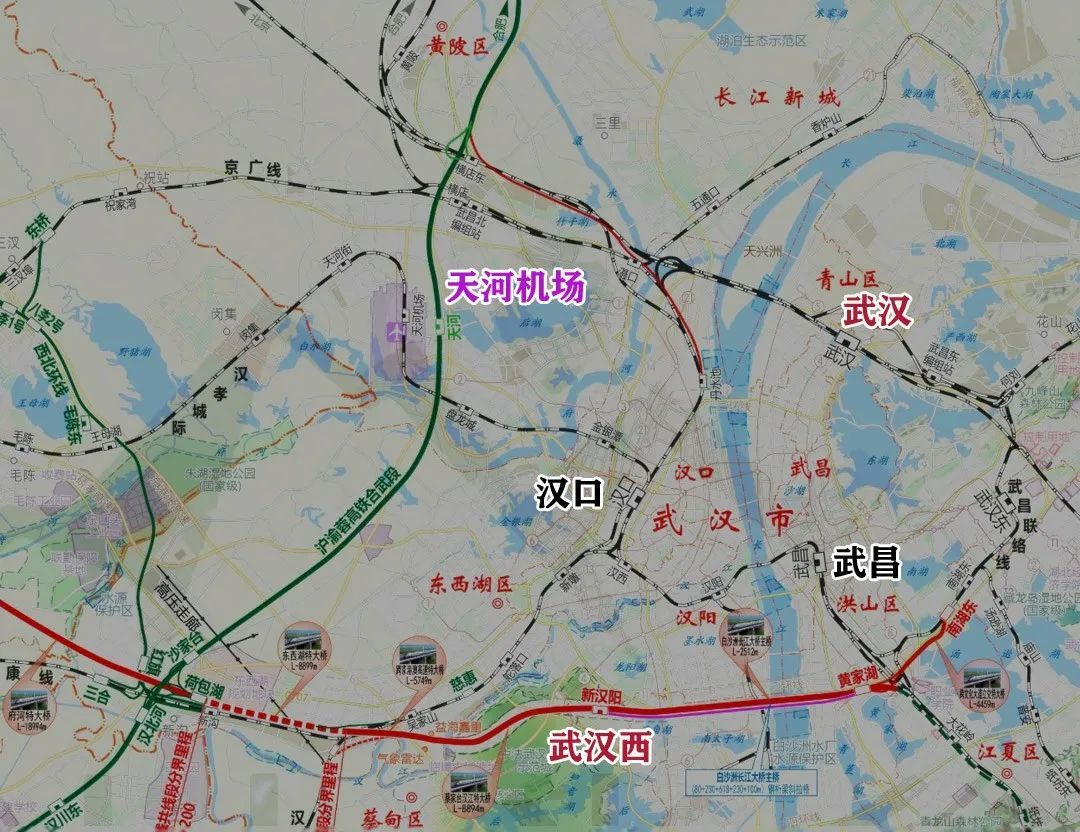 在长江经济带中,武汉亦居地理中心位置。将启动沿江高铁武汉天河站、长江新城站和西武高铁-武汉枢纽直通线武汉西(新汉阳)站的建设。