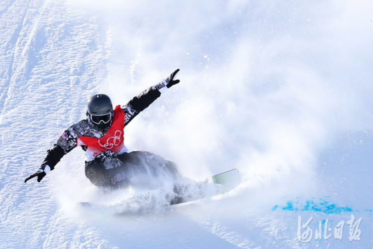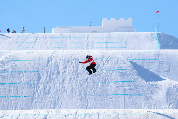 2022年2月2日,在北京2022年冬奥会张家口赛区云顶滑雪公园坡面障碍技巧赛道,单板运动员在进行赛前训练,备战即将到来的冬奥比赛。 河北日报记者耿辉摄影报道