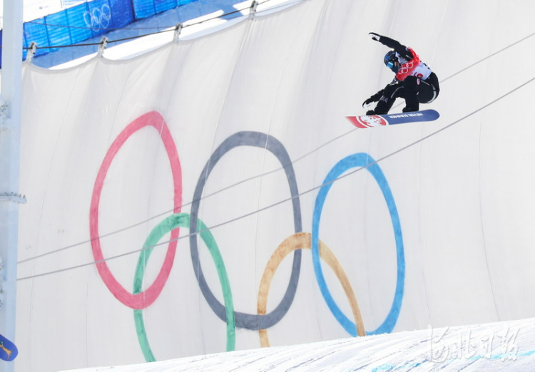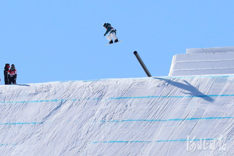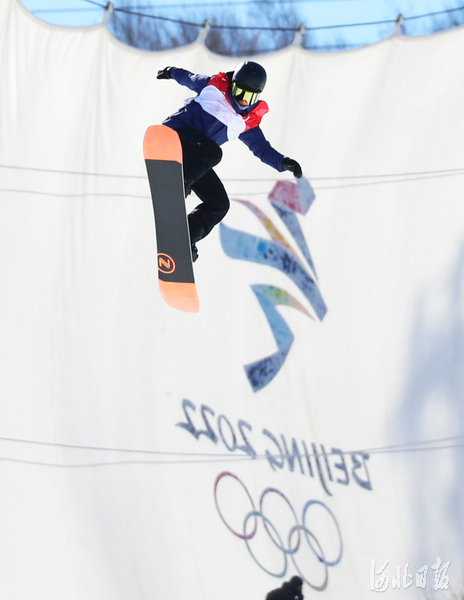 2022年2月2日,在北京2022年冬奥会张家口赛区云顶滑雪公园坡面障碍技巧赛道,单板运动员在进行赛前训练,备战即将到来的冬奥比赛。河北日报记者耿辉摄影报道