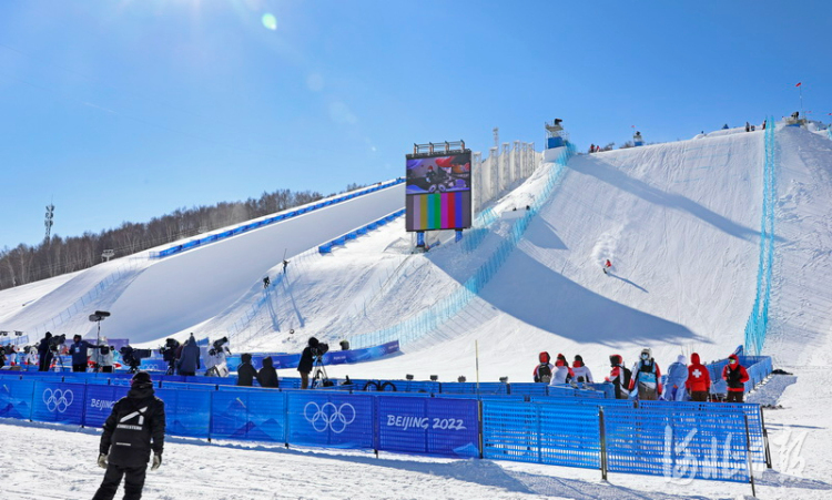 2022年2月2日,北京2022年冬奥会张家口赛区云顶滑雪公园坡面障碍技巧赛道,单板运动员在进行赛前训练。2月5日,这里将进行单板滑雪女子坡面障碍机巧资格赛。河北日报记者耿辉摄影报道