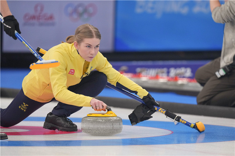 2月7日,瑞典选手阿尔米达·德瓦尔在北京2022年冬奥会冰壶混双比赛中。新华社记者 周 密摄