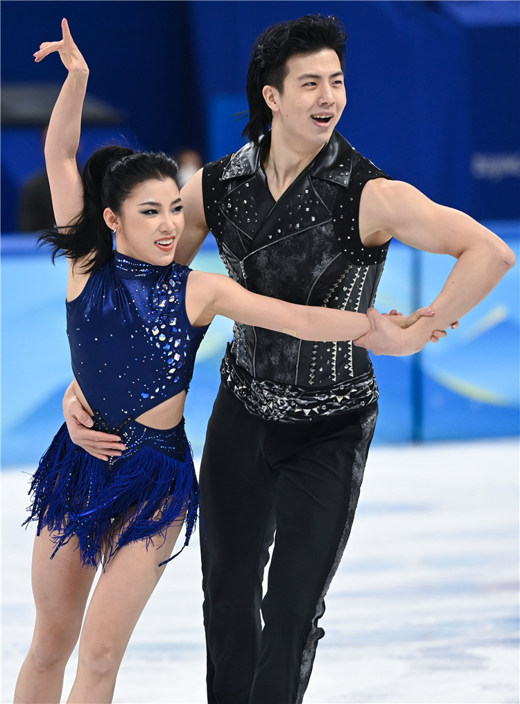 2月12日,中国选手王诗玥(左)/柳鑫宇在北京2022年冬奥会花样滑冰项目冰上舞蹈韵律舞比赛中。 新华社记者 马 宁摄