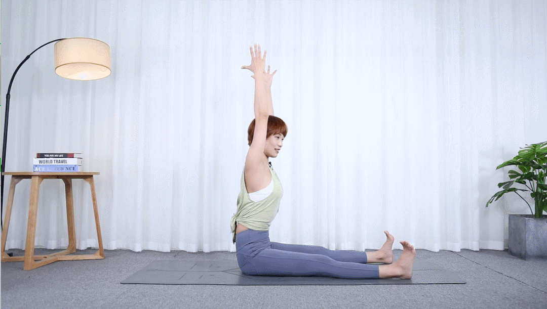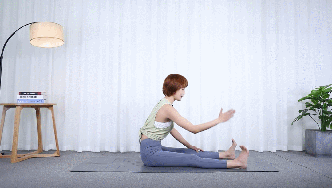双腿向前伸直,两腿向外分开,可以大于骨盆的宽度,脚心向外,脚尖垂直回勾。
