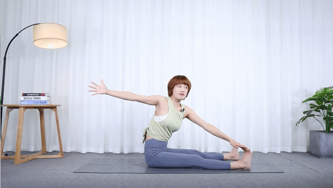 呼气,收腹部,转体向右后方,左手对着右脚落下来,可以抓脚或向前方伸展,右手向后方伸展。