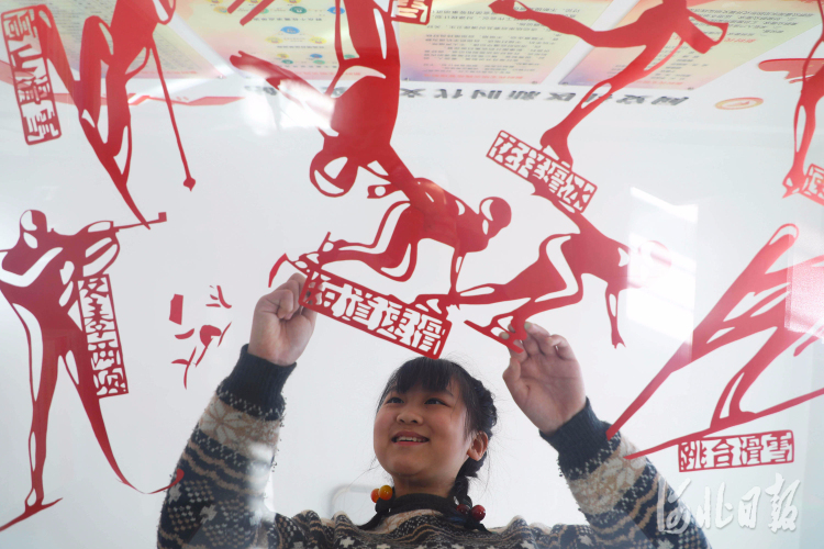 2022年2月21日,在河北省唐山市丰润区太平路街道同安社区,小朋友在制作冬奥主题剪纸。河北日报通讯员朱大勇摄影报道