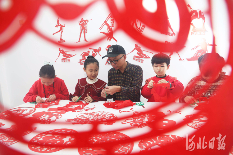 2022年2月21日,在河北省唐山市丰润区太平路街道同安社区,民间艺人陈晓远在教小朋友制作冬奥主题剪纸。当日,河北省唐山市丰润区太平路街道同安社区开设公益课堂,邀请民间艺人教小朋友制作冬奥主题作品,丰富孩子们的寒假实践生活。河北日报通讯员朱大勇摄影报道