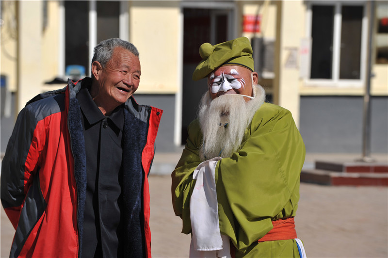 2月22日,在石家庄市深泽县故城村,一名村民与深泽县坠子剧团演员交流。