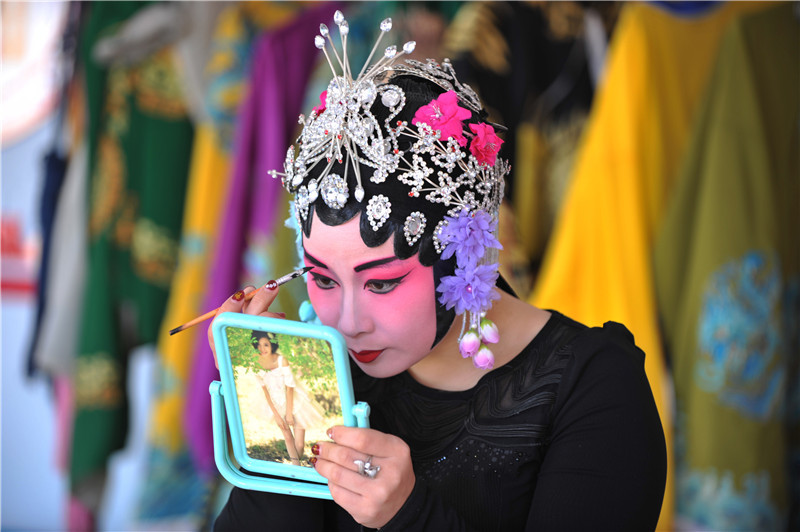 2月22日,在石家庄市深泽县故城村,深泽县坠子剧团的演员在化装。