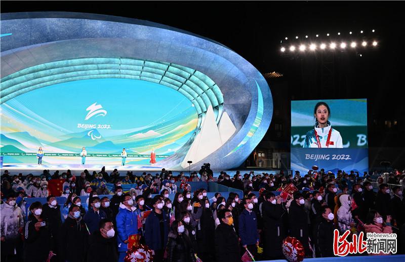 3月6日晚,北京冬残奥会张家口赛区首场奖牌颁发仪式在张家口颁奖广场举行。河北日报记者 贾恒摄