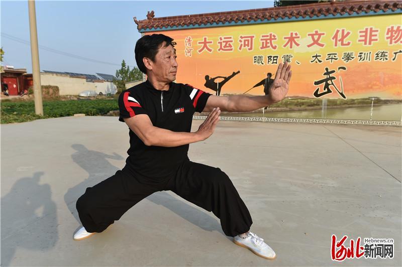 这幅活灵活现的水韵画卷,吸引的不只是我们,还有世代生活在此的村民。河北省省级非遗项目曦阳掌太平拳代表性传承人牛海岭,是土生土长的朱唐口村人。出生在武术世家的牛海岭喜欢在运河边习武练拳,不仅因为这水默默孕育着沿岸人民的强健与鲜活,更因为这水为清河注入了一股子豪气。牛海岭自豪地说,清河县是打虎英雄武松的故乡,自古以来就有崇侠尚武的传统,当地传习有太极拳、八卦掌、太平拳等十几种武术门类,习武者达数万人。其中,曦阳掌太平拳在清河县境内流传最为广泛。