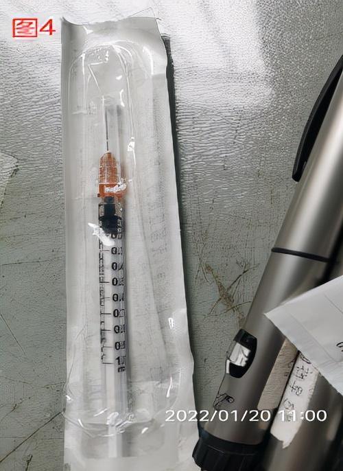 图4中抽出的4单位胰岛素由于某种原因未及时注射,也未在抽出的注射器上做任何标识。根据宗志勇、蔡虻、赵菁主编的《临床注射操作医院感染风险防控手册》安全注射要求:注射器或输液袋上应粘贴标签,标明患者信息、药名、剂量、配药人、配药日期和时间。可见图4违背了安全注射的原则。
